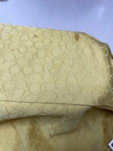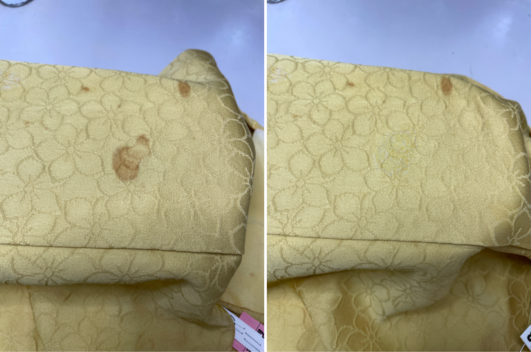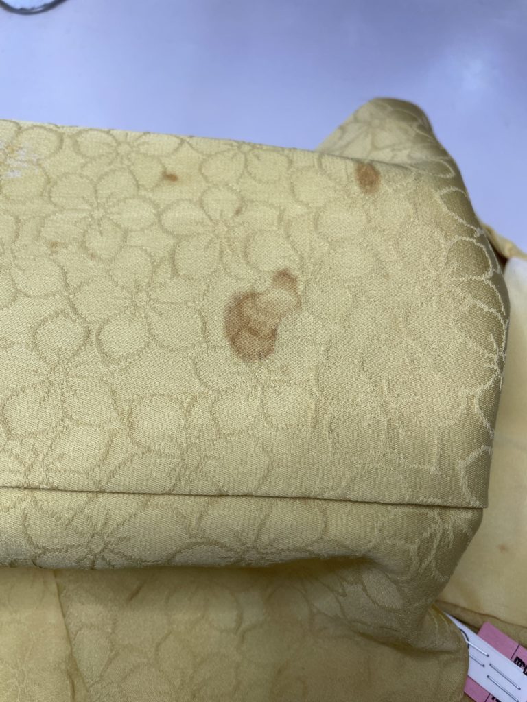 茶色く変色した古いシミ 2026年1月12日(月) 最終更新日時 : 2026年1月13日(火) kimono_lavage 今回の事例は 着物に付着した茶色く変色した古いシミです。 シミは付着してから時間が経つと酸化してだんだんこげ茶色になっていきます。 かなり古いシミのようで茶色く変色しています。 生地の痛みも気になるので気をつけながら漂白していきます。 やはり生地の色も一緒に抜けてしまいました。 でもご安心ください 信越長染会の染色補正技術で復元していきます。 このように復元することができました。 このような古いシミでも安心してラヴァージュにご相談ください。 FacebookXBlueskyHatenaCopy